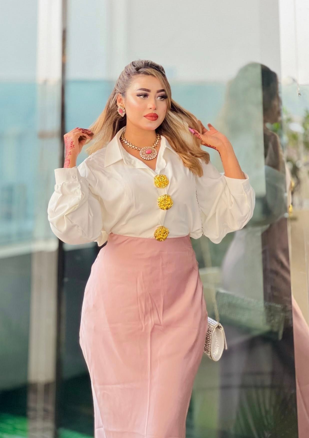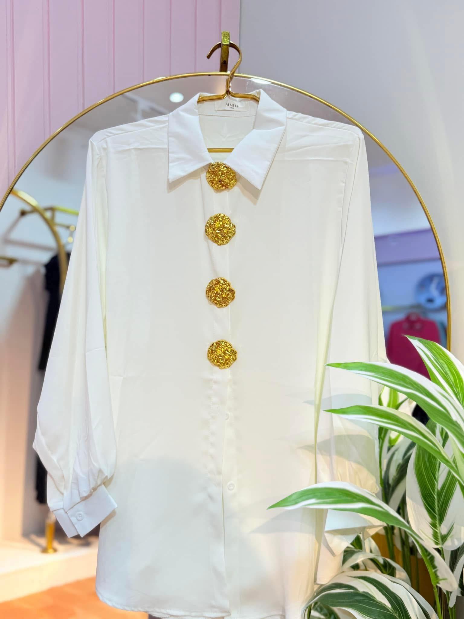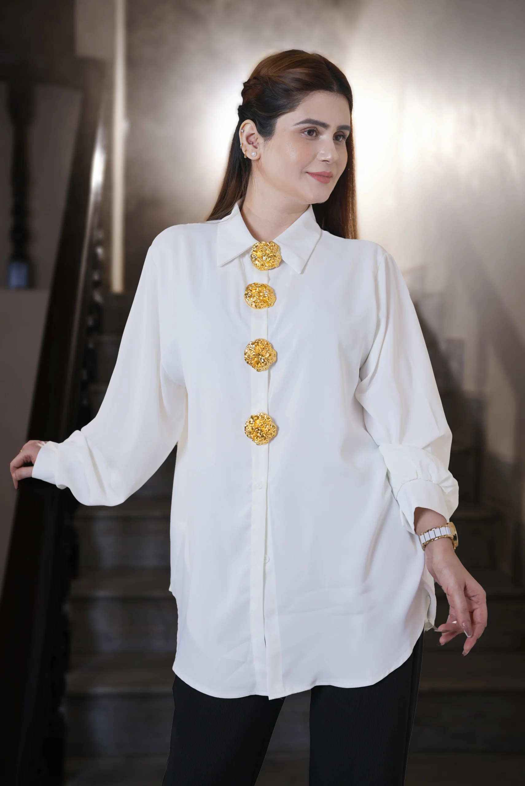 Imported white silk loose-fit ladies shirt with golden metal buttons, 30 inches long, free size fits up to body size 50