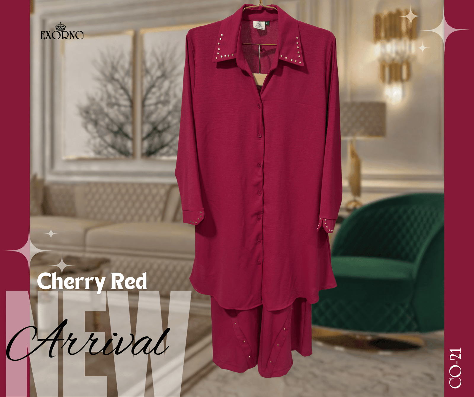 Product Description: Step into effortless sophistication with this stunning Cherry Red co-ord set—designed for the modern woman who loves to stand out with grace and confidence. Made from imported CEY crepe airflow fabric, this set offers a smooth, breathable feel and an ironless finish that makes it as practical as it is striking. The vibrant Cherry Red color is elevated by chic golden stud decor details throughout, guaranteeing you an unforgettable, bold look.