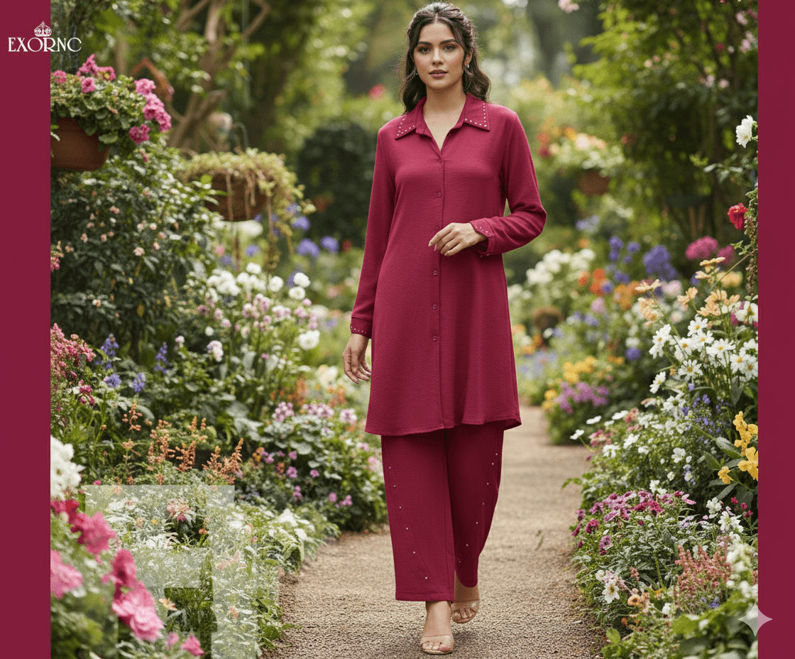Why You’ll Love It: This Cherry Red co-ord is a certified showstopper. It combines the effortless comfort of ironless CEY crepe airflow fabric with the luxe appeal of golden stud detailing. Bold, breathable, and beautifully crafted, it is the ultimate outfit for making a powerful, elegant statement.