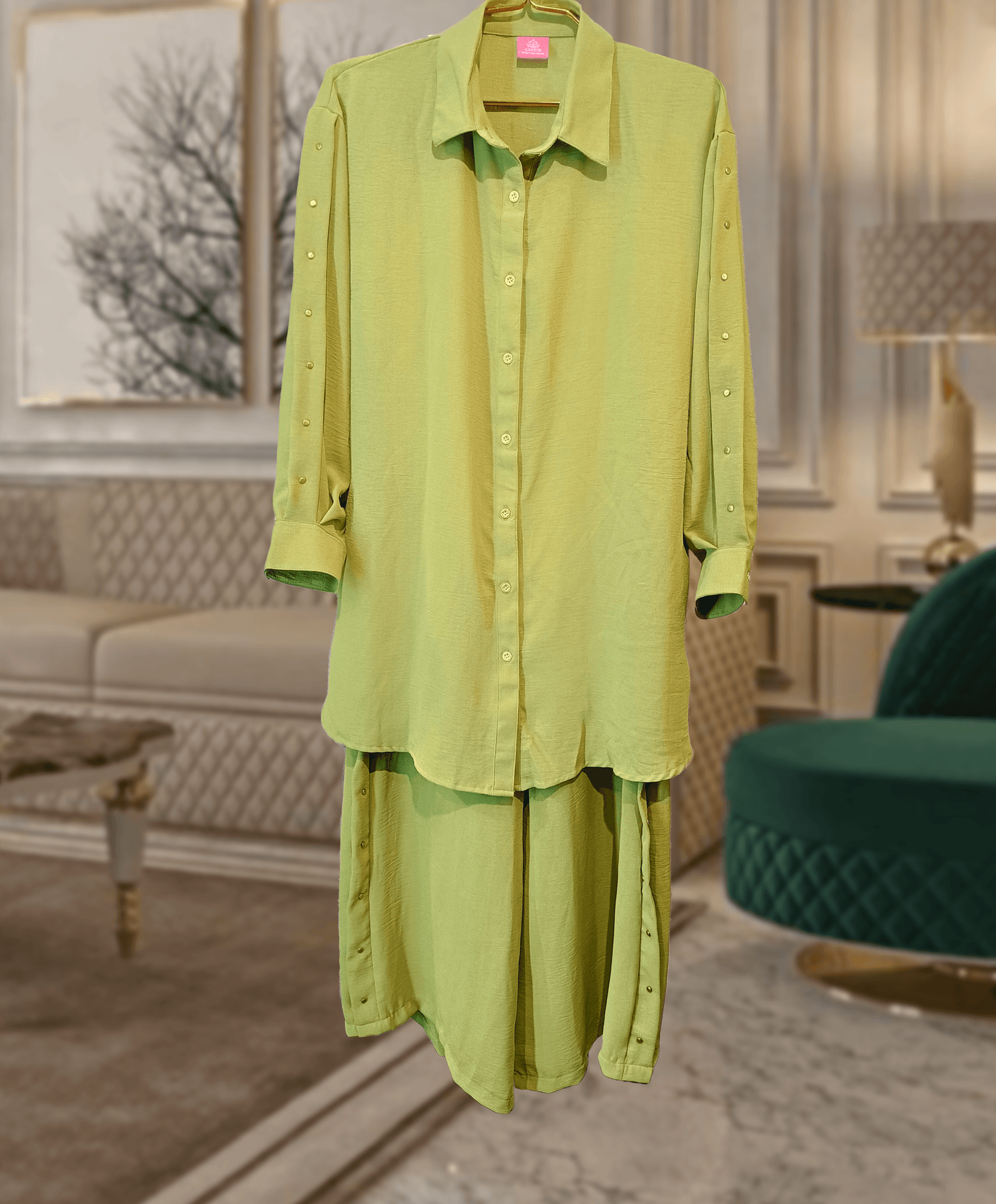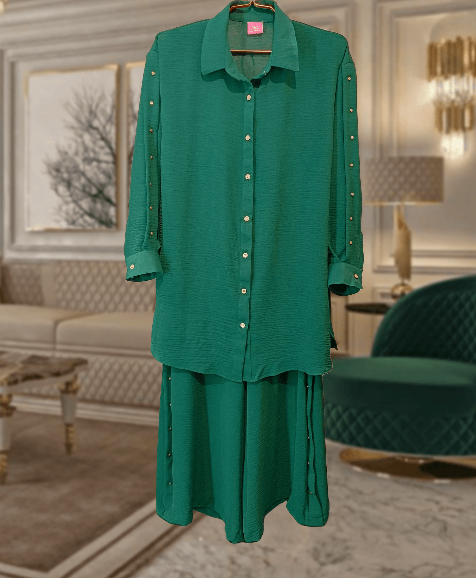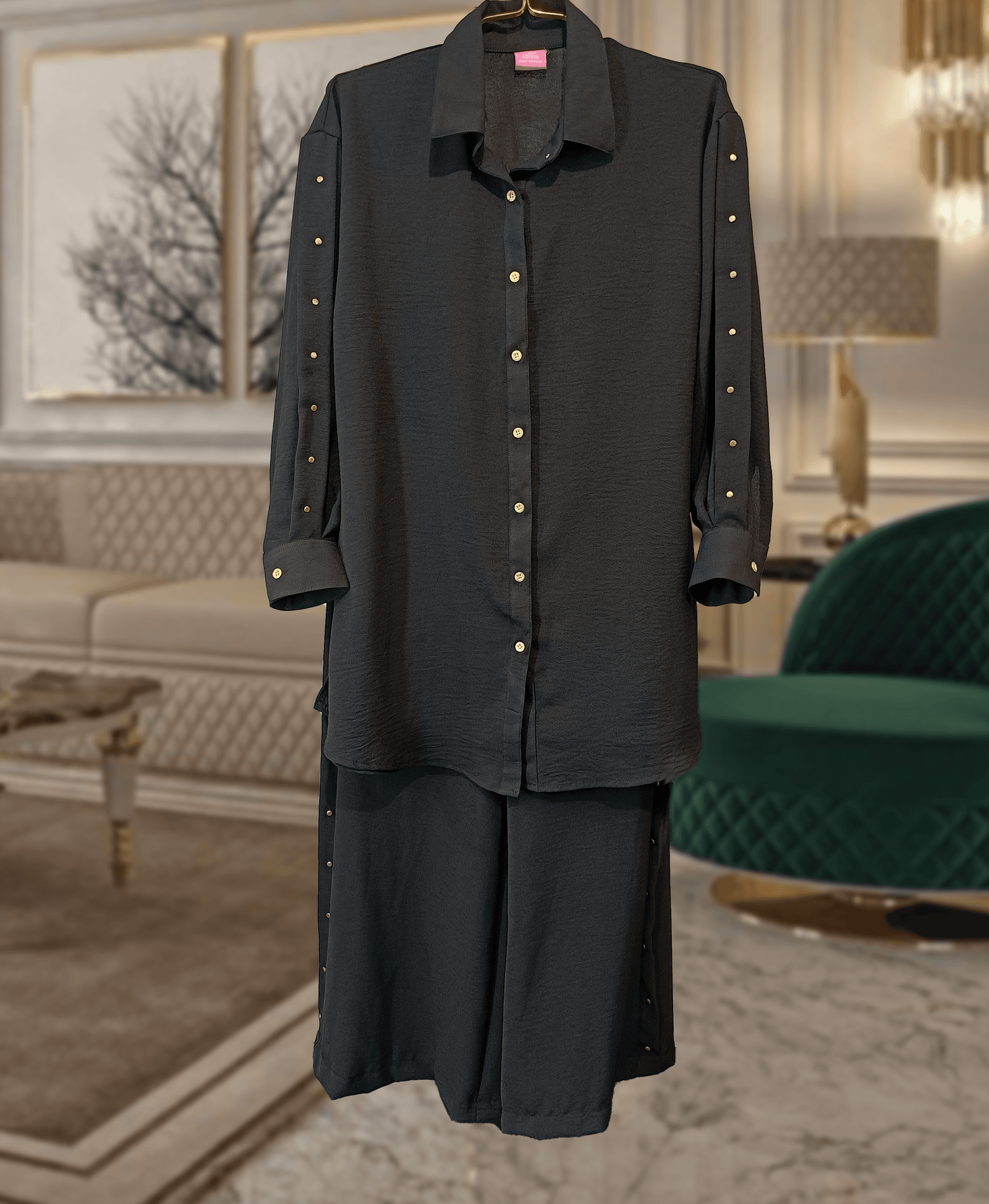 This co-ord brings together premium fabric, functional design, and standout gold accents — all in one ultra-comfortable set. Whether you’re dressing up for brunch or styling it with heels for the evening, this set is a wardrobe must-have.