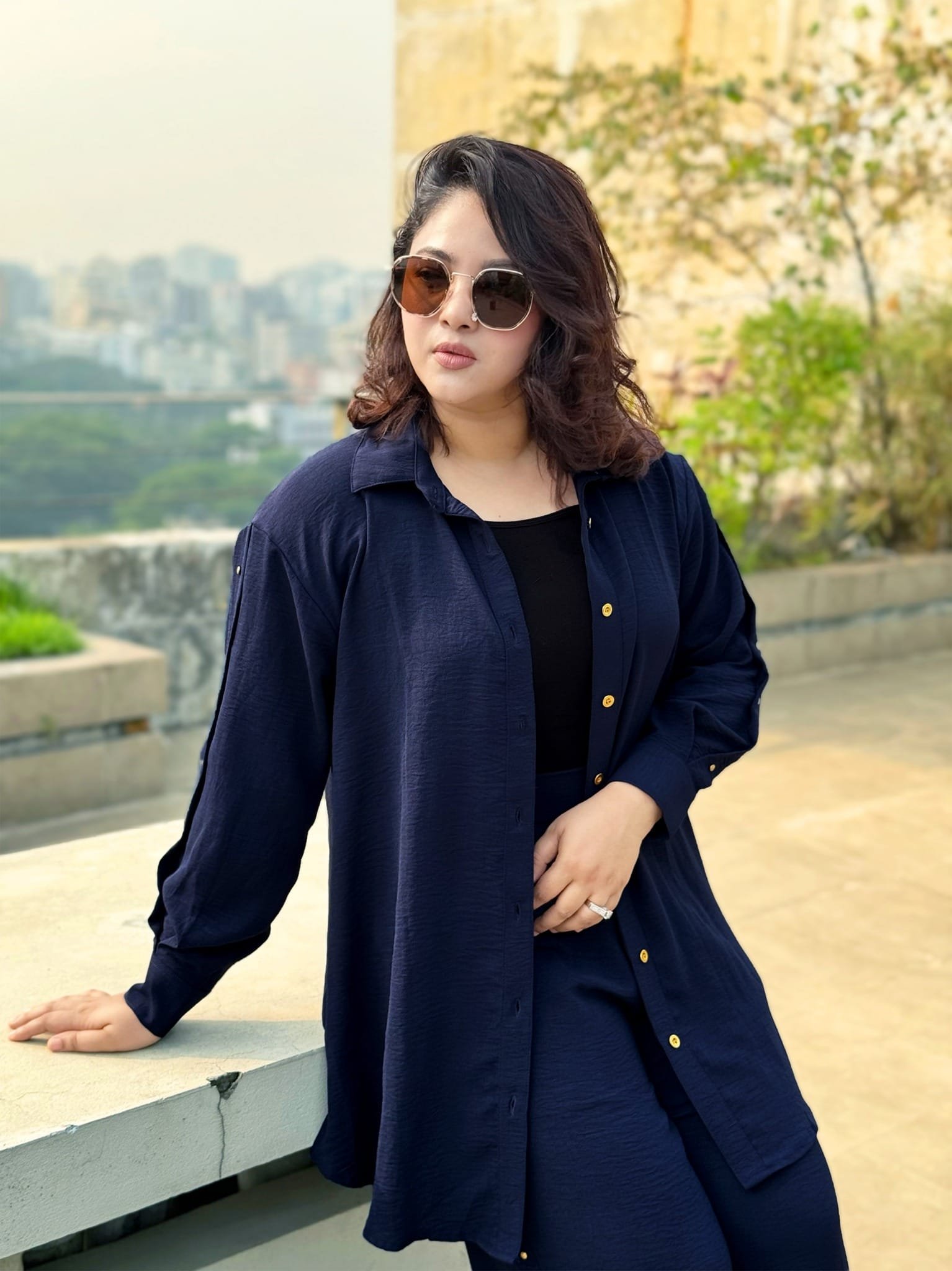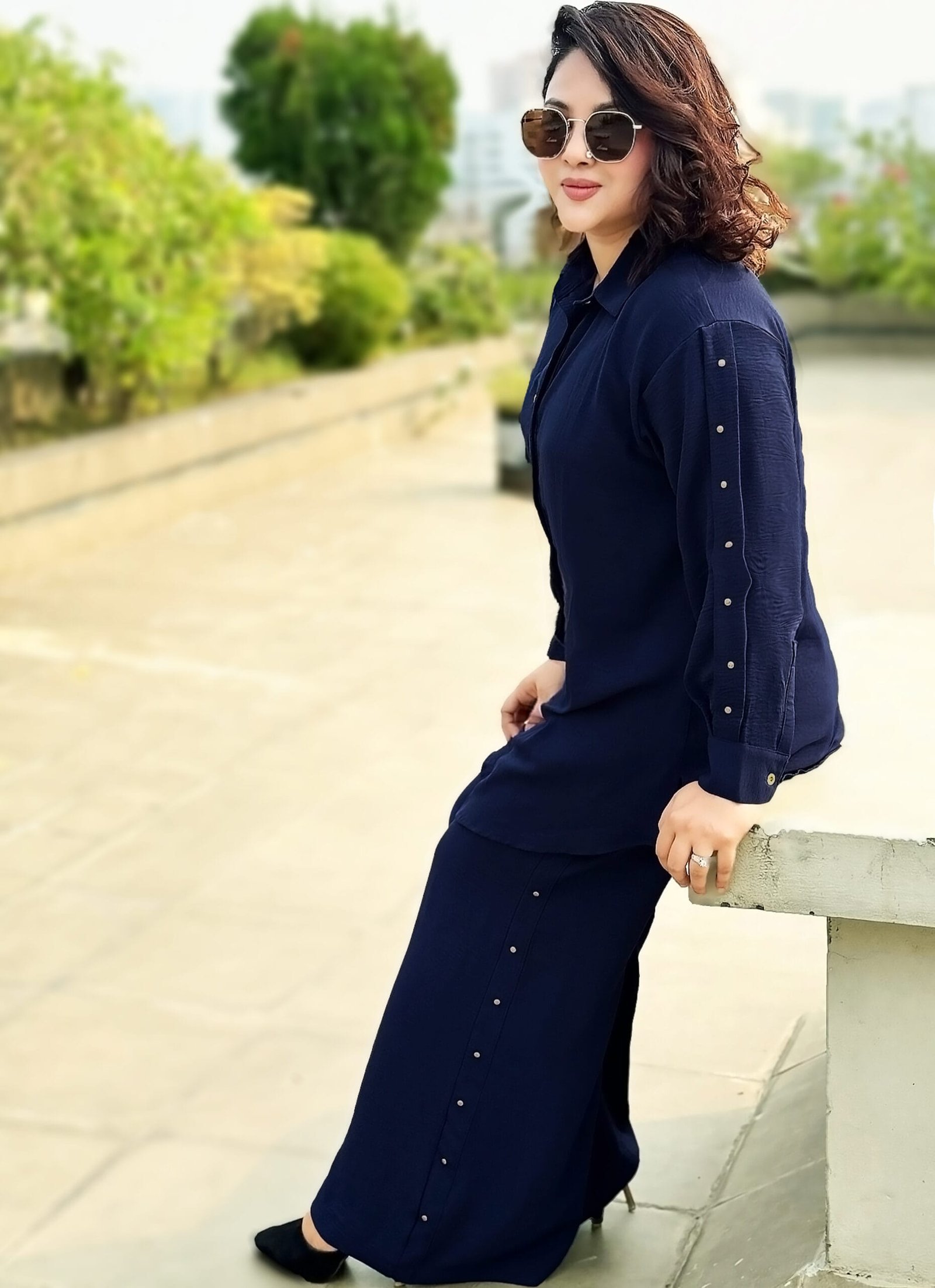 Elevate your wardrobe with this chic navy blue co-ord set crafted from luxurious Thai cheese cotton, offering a beautiful drape and comfortable feel. This set is designed for effortless style, whether you’re dressing up for an event or keeping it casual. The entire look is unified by eye-catching golden stud work running down the sleeves of the shirt and the sides of the trousers.