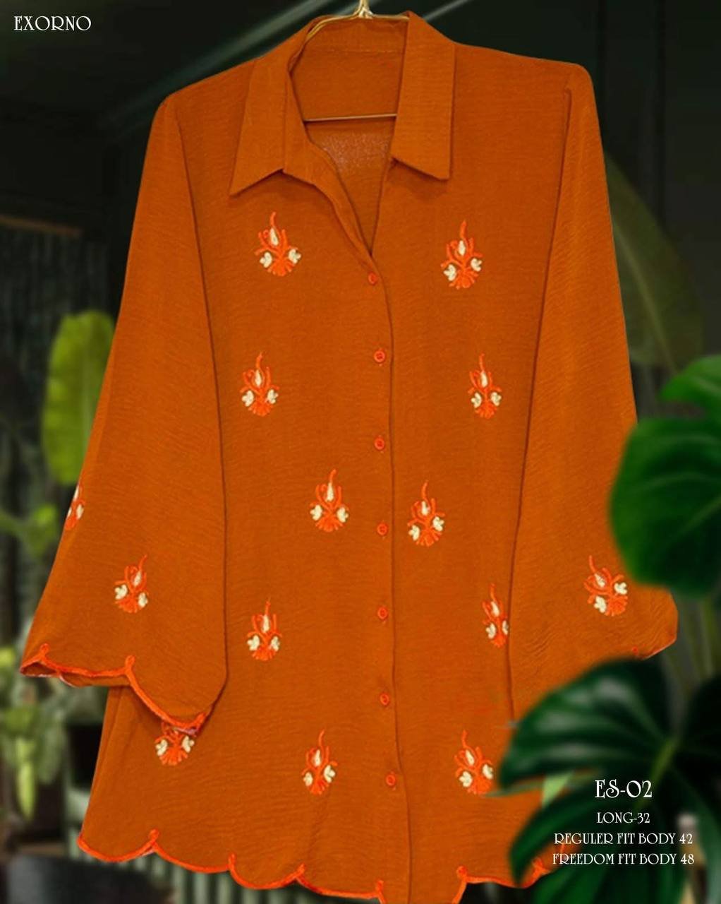 Warm tones meet artisanal elegance. The ES-02 is a standout piece in a rich, earthy rust hue, perfect for transitioning through the seasons. This button-down shirt features a distinct textured fabric adorned with delicate floral embroidery and a signature scalloped hemline. Designed for versatility, it offers a flowing silhouette that balances modern style with classic craftsmanship.