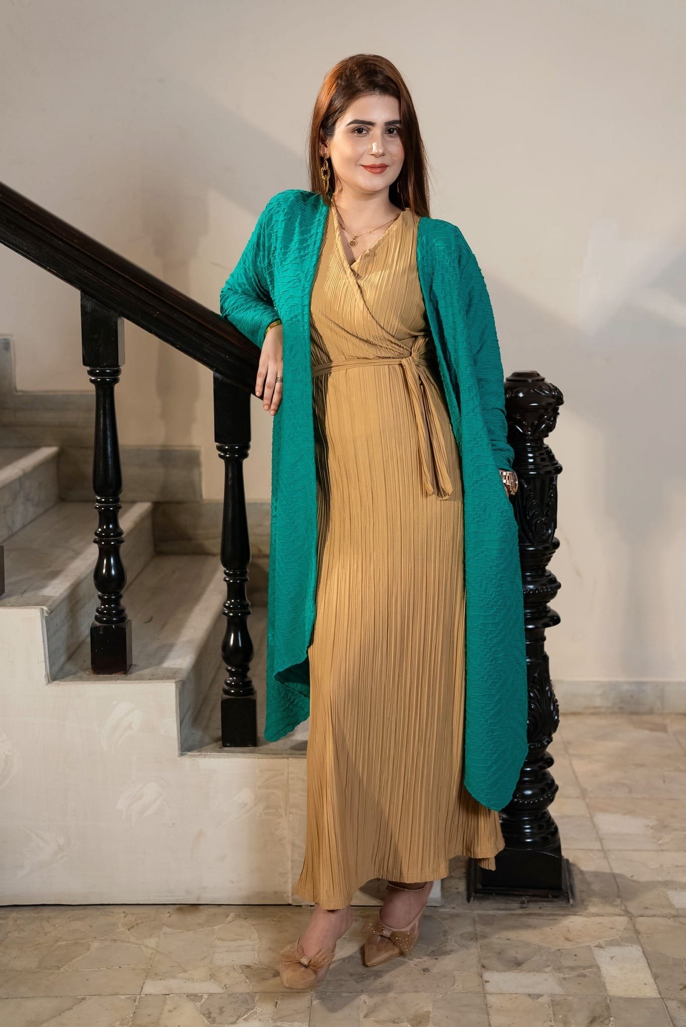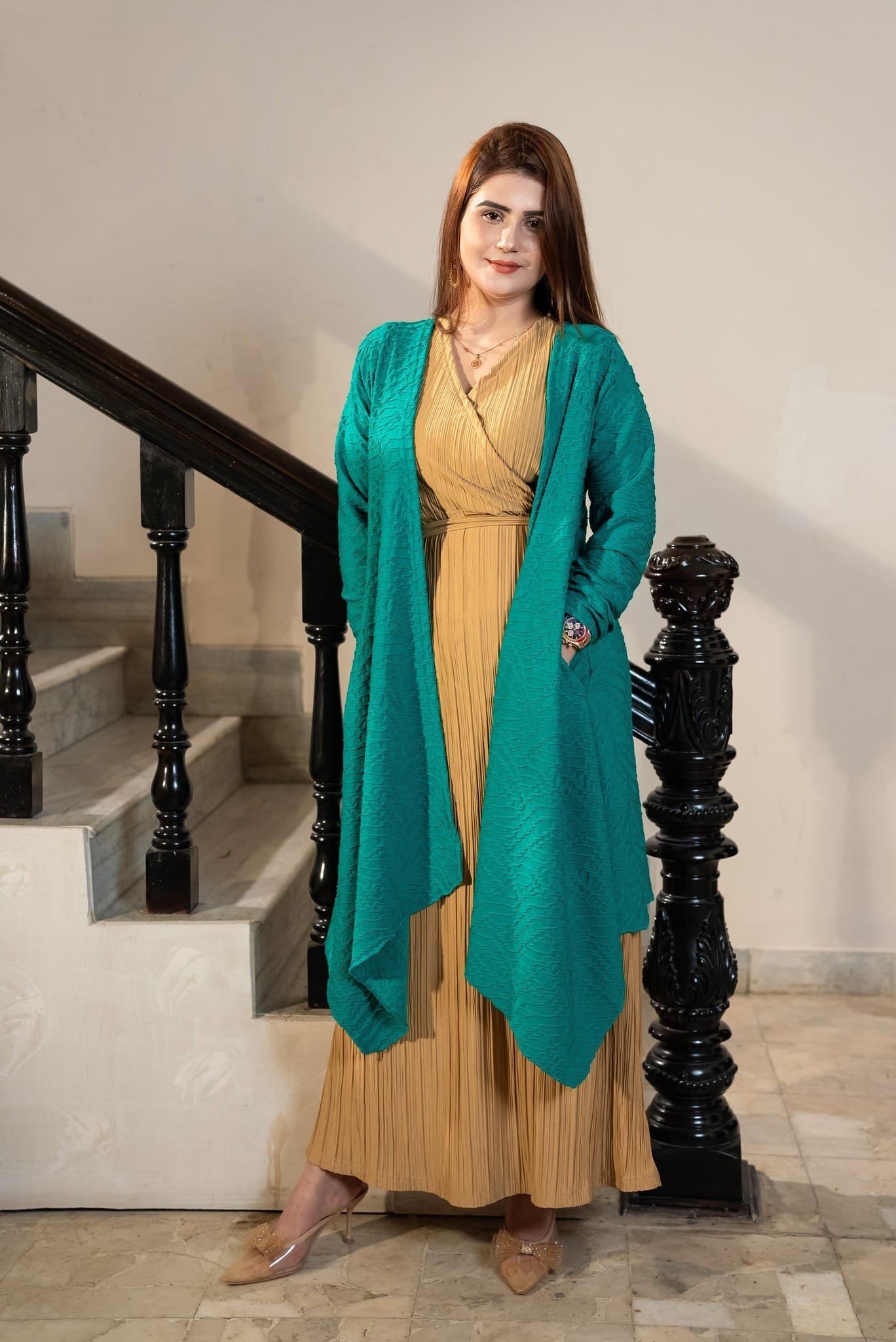 Product Name: Green Ribbed Cotton Shrug – Semi-Long, A-Line Slim Fit