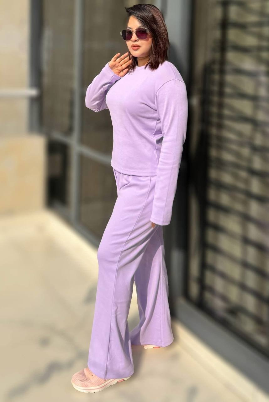 • Set Includes: One long-sleeve crewneck top and one pair of wide-leg flare pants.