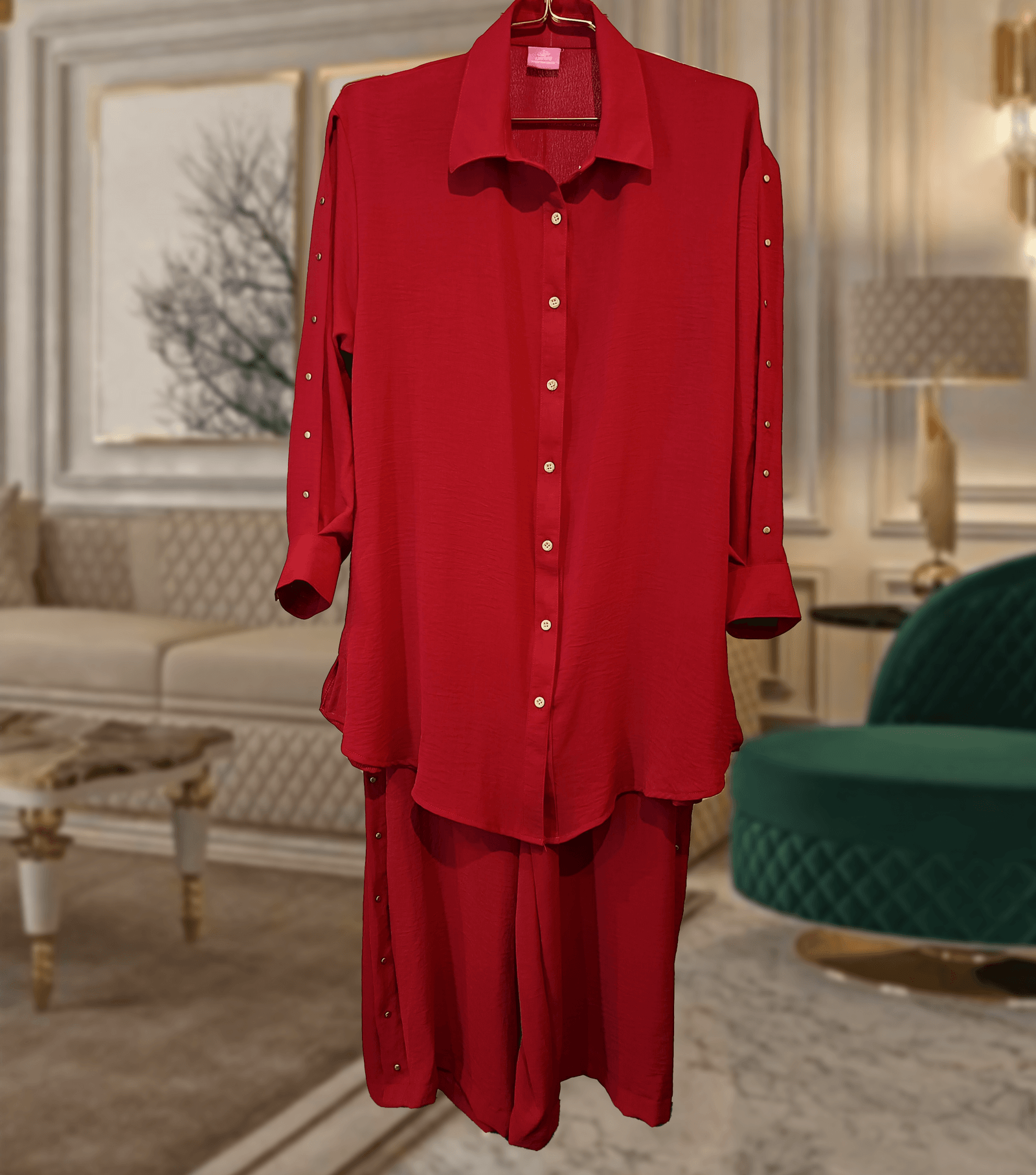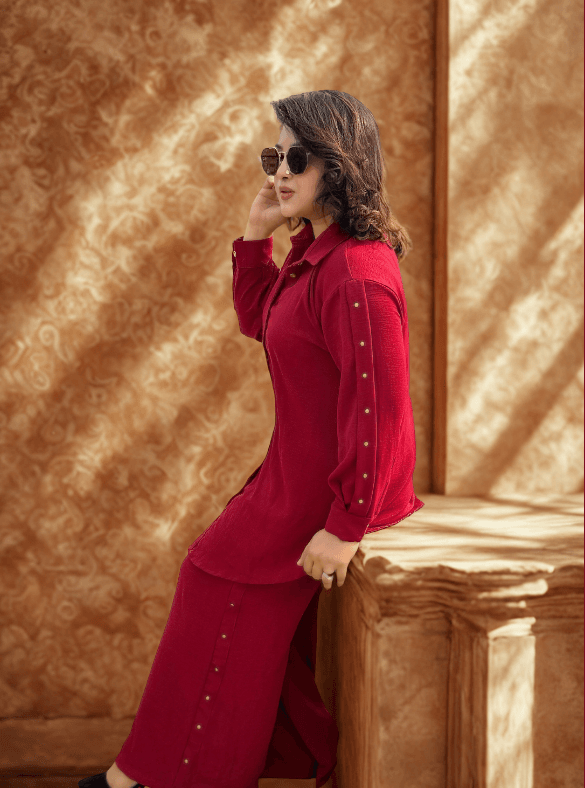 This maroon co-ord brings together premium fabric, functional design, and standout gold accents — all in one ultra-comfortable set. Whether you’re dressing up for brunch or styling it with heels for the evening, this set is a wardrobe must-have.
