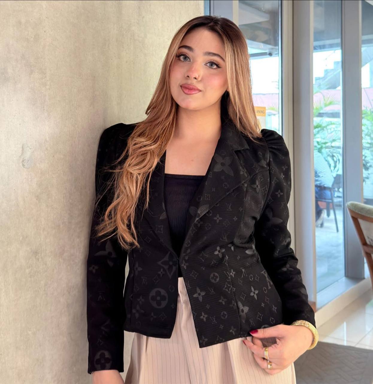 Product Description: Redefine your professional wardrobe with our Signature Monogram Cropped Blazer. This sophisticated piece features a rich, embossed tonal pattern that offers a subtle nod to high-fashion luxury. The sculpted puff shoulders create a powerful, feminine silhouette, while the tapered cropped waist ensures a modern fit.