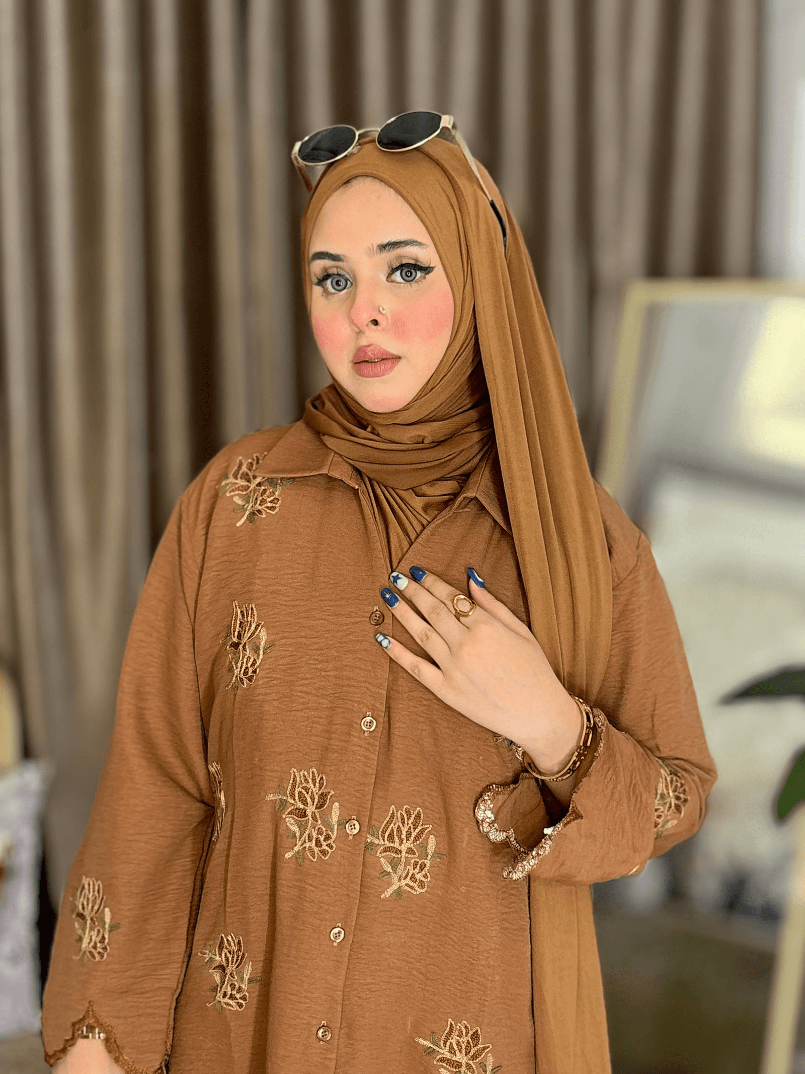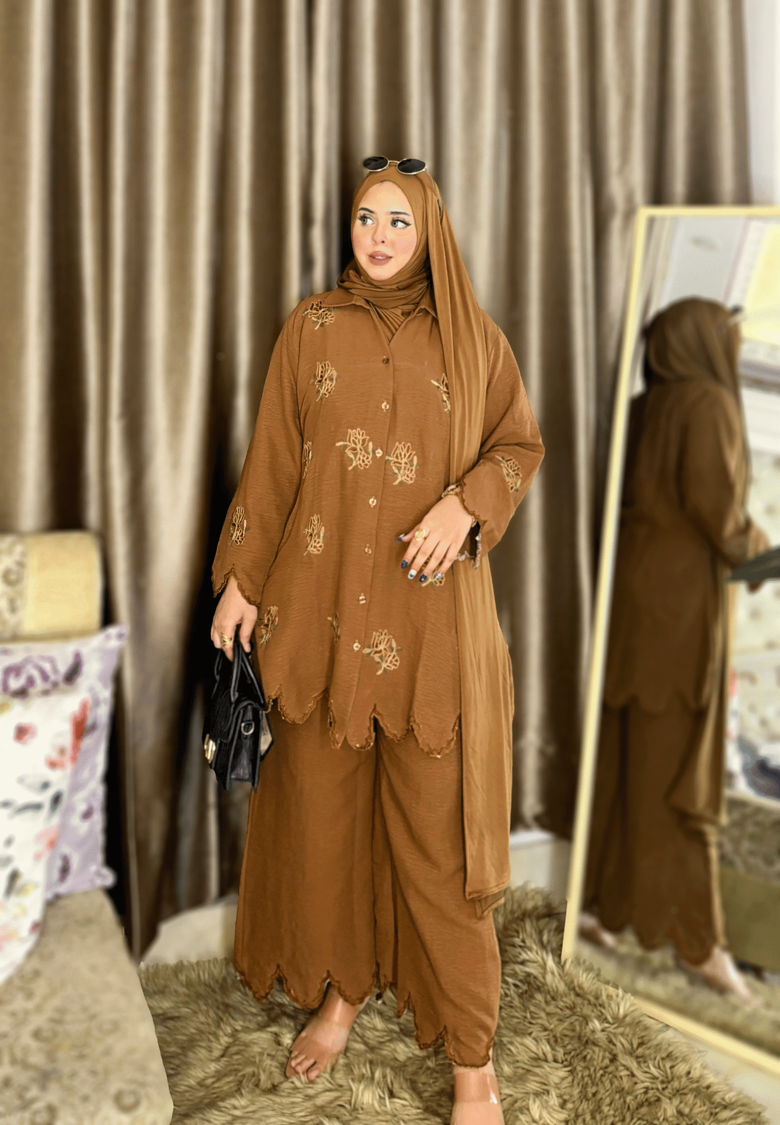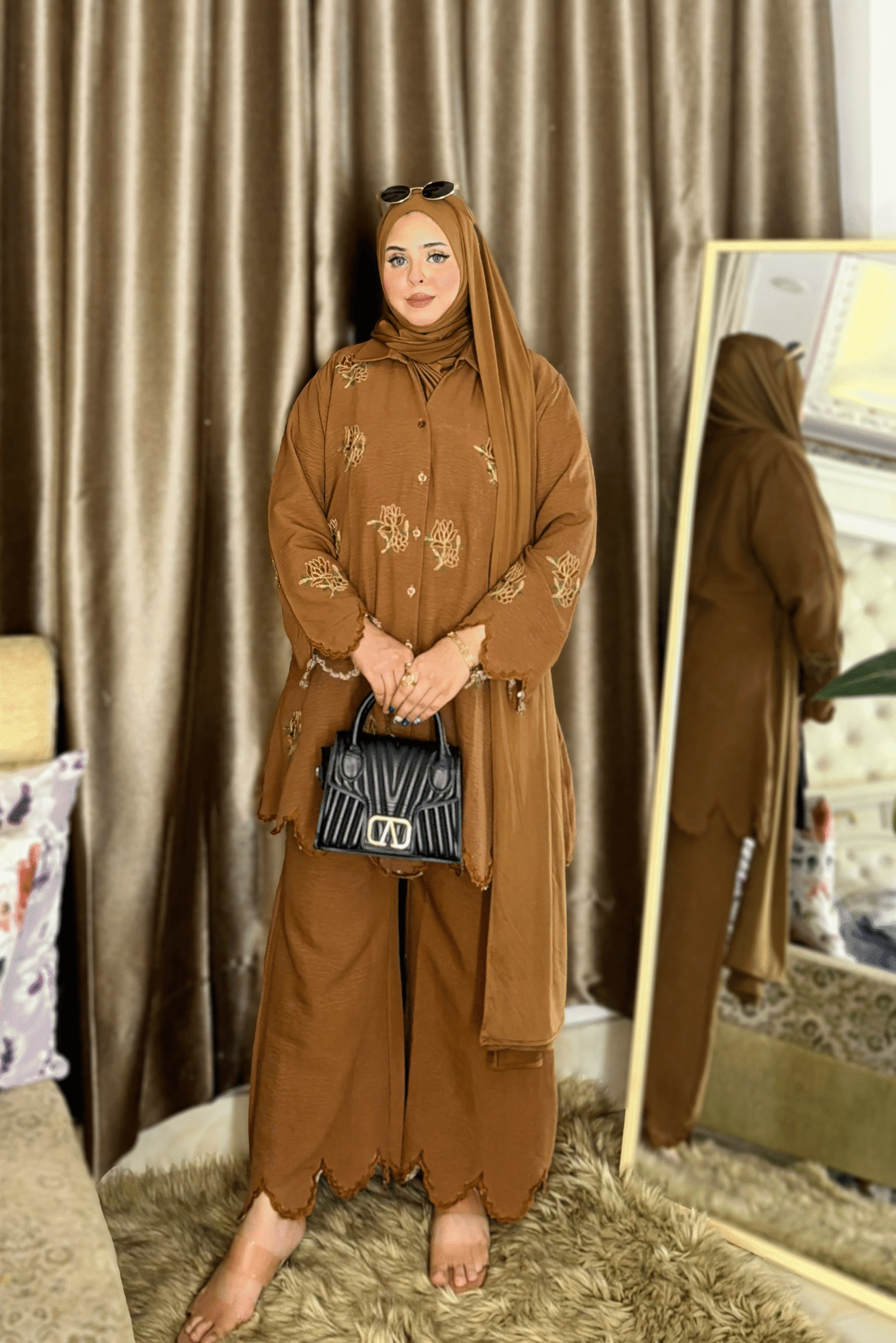 The Brown Co-Ord Set is your ultimate canvas for sophistication. To achieve a Modest Formal look perfect for special family events, pair it with a soft Tan or Beige Chiffon Hijab, classic Black Heels, and a structured Black Bag. This highlights the gold embroidery in a traditional way.