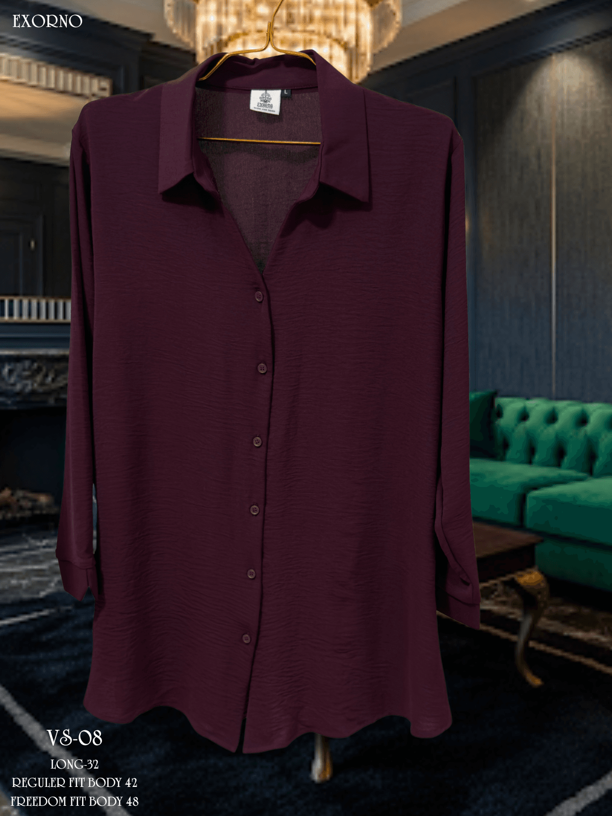Exude sophistication with the Velvet Dusk V-Neck Longline Shirt. Designed in a 32-inch longline cut, this deep wine-colored shirt blends modesty with modern elegance. Ideal for casual outings, evening gatherings, or layered looks, this versatile piece adds a luxurious touch to any wardrobe.