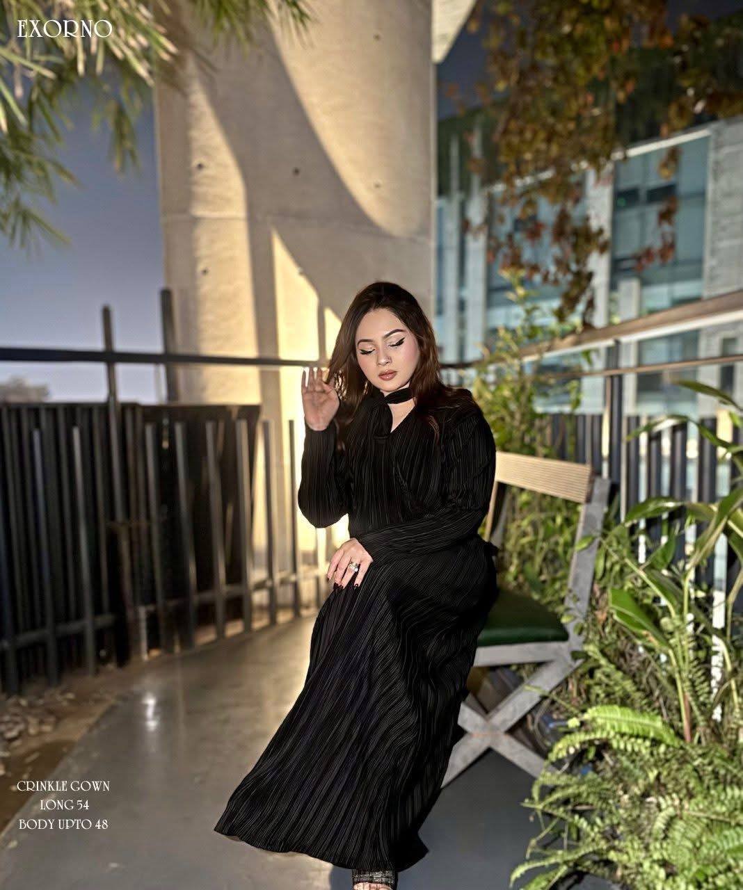 • Design: An elegant, floor-length gown featuring a unique crinkle-textured fabric that offers both comfort and a high-end look.